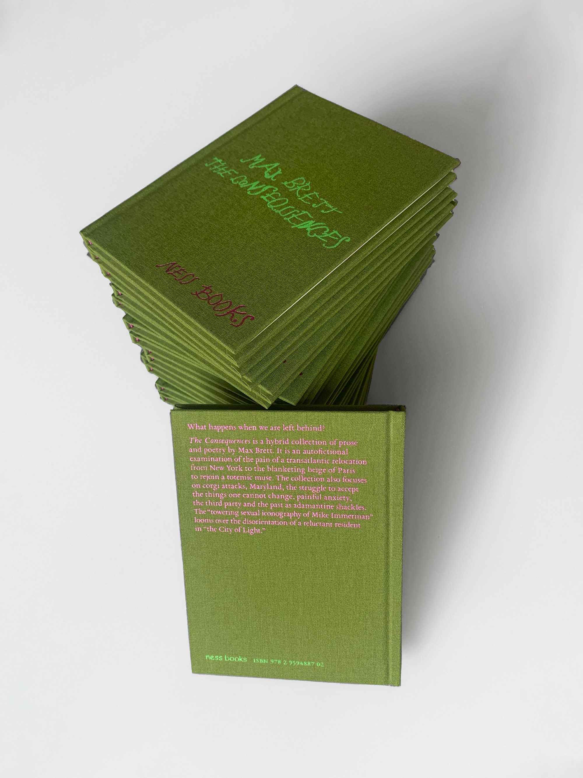 The Consequences is a hybrid collection of prose and poetry by Max Brett. It is an autofictional examination of the pain of a transatlantic relocation from New York to the blanketing beige of Paris to rejoin a totemic muse. The collection also focuses on corgi attacks, Maryland, painful anxiety, the struggle to accept the things one cannot change, the third party and the past as adamantine shackles. The "towering sexual iconography of Mike Immerman" looms over the disorientation of a reluctant resident in “the City of Light.”